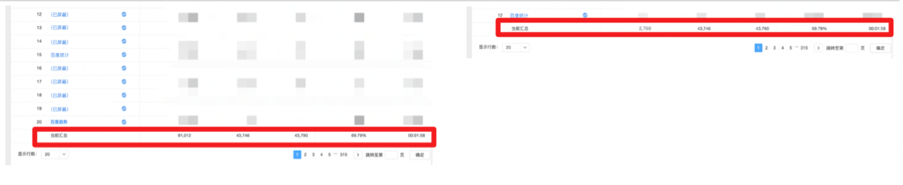 除網站概況報告外,我們在各處詳細報告為用戶提供了“選擇”按鈕,支持用戶自主篩選包含/不包含已屏蔽數據。以搜索詞報告為例,如果想剔除這部分已經屏蔽的數據,只需要在篩選項中選擇不包含智能屏蔽的數據,那么在報告明細中則不會包含已屏蔽的內容,數據報告明細表中每頁的“當頁匯總”會更新相應的數據。