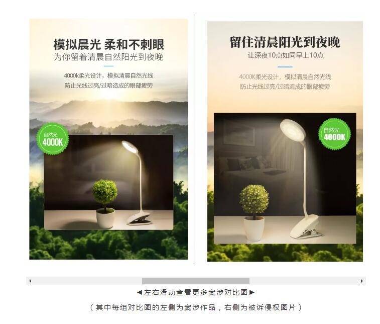 對此,法院認為,案涉權利圖片主要采取圖文結合的方式,其中的“圖”主要是以臺燈、人物、場景、植物、裝飾為主要元素進行的攝影創作,其體現了作者對于拍攝角度、明暗光線、距離和光圈以及拍攝場景的個性化安排或選擇,具有獨創性,構成攝影作品;其中的“文”主要是對臺燈性能的一種描述,并配合照片本身進行解釋說明,本身不構成作品。但“圖”與“文”的選擇、相對位置、編排順序,“圖”的比例、張數、位置以及“文”所使用的字體樣式、顏色、大小、排列等整體具有一定的獨創性,梵某公司取得了案涉作品的著作權登記證書,可以認定梵某公司是案涉作品的著作權人。